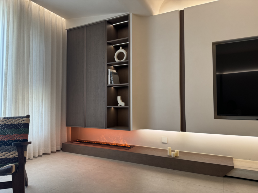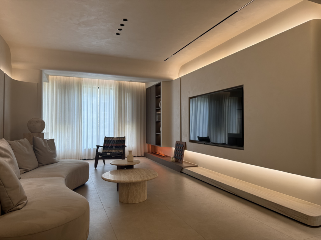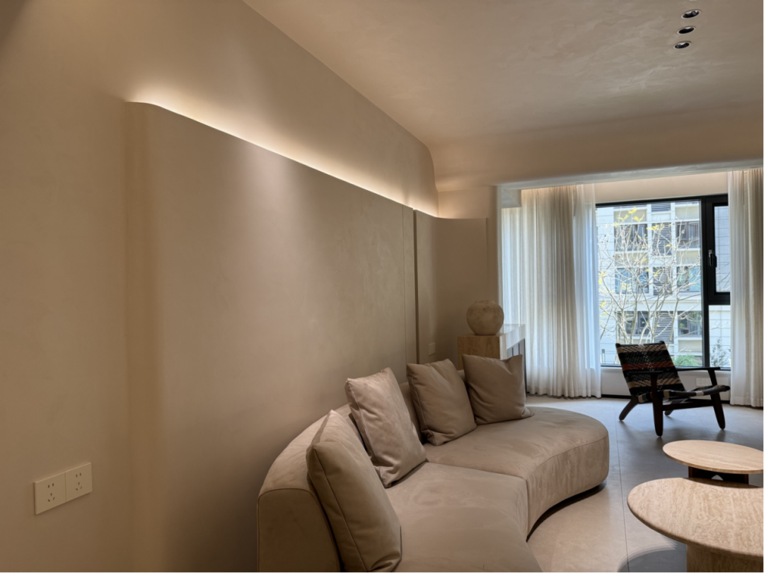 主人说,最爱的是晚上窝在客厅的时刻:氛围灯顺着墙面肌理漫开,墙顶一体的设计让空间没有 “割裂感”,连远处书柜里的书脊,都裹在柔雾里;朋友来做客,总忍不住伸手摸墙面,“第一次觉得,墙也能有‘拥抱感’”。