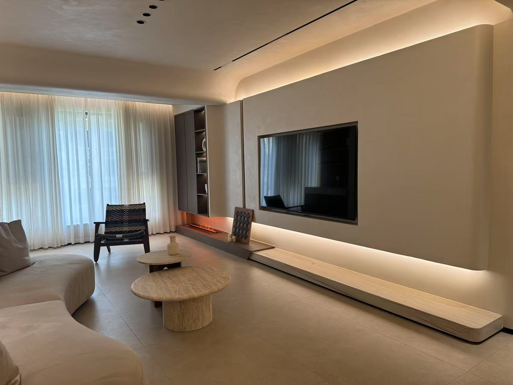 主人说,最爱的是晚上窝在客厅的时刻:氛围灯顺着墙面肌理漫开,墙顶一体的设计让空间没有 “割裂感”,连远处书柜里的书脊,都裹在柔雾里;朋友来做客,总忍不住伸手摸墙面,“第一次觉得,墙也能有‘拥抱感’”。