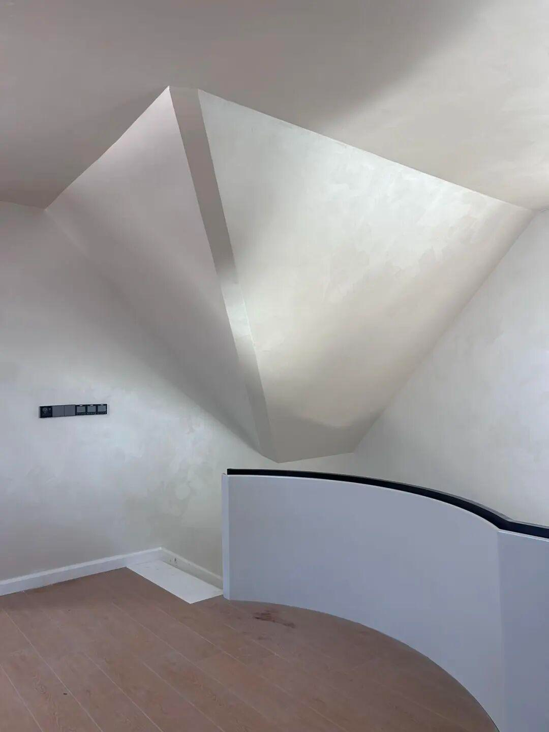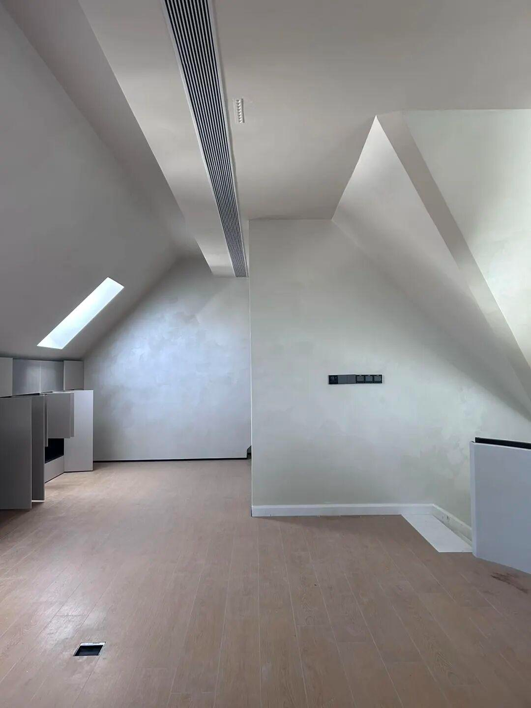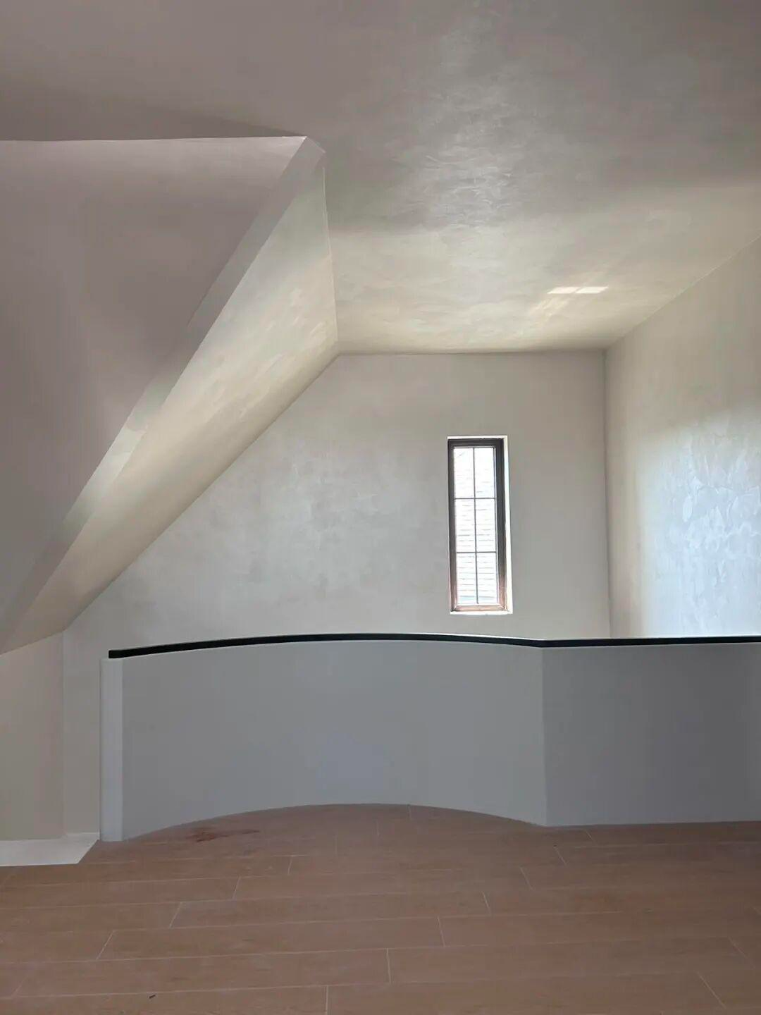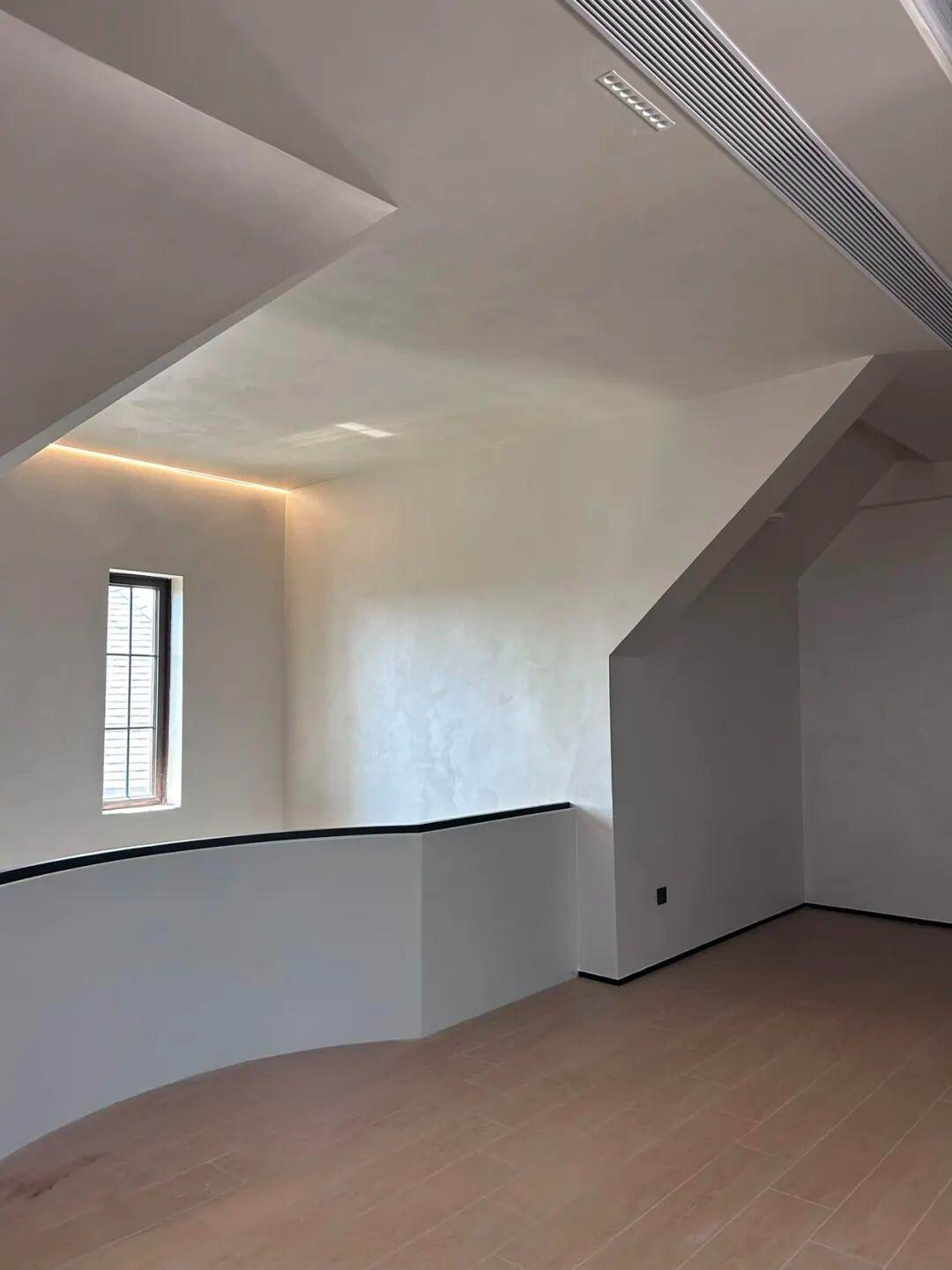 针对顶层不规则的斜顶与弧形结构,珍珠绒的可塑性被发挥到极致。涂料流畅地覆盖在斜顶、弧形栏杆与转折墙面上,弱化了复杂结构的突兀感;天窗与高窗引入的自然光,在珍珠绒的肌理上形成丰富的明暗层次,原本逼仄的斜顶空间,因柔和的材质包裹而成为充满治愈感的静谧场域。浅木色地板与珍珠绒的暖白质感呼应,为未来的功能布局预留了充满想象的质感基底。