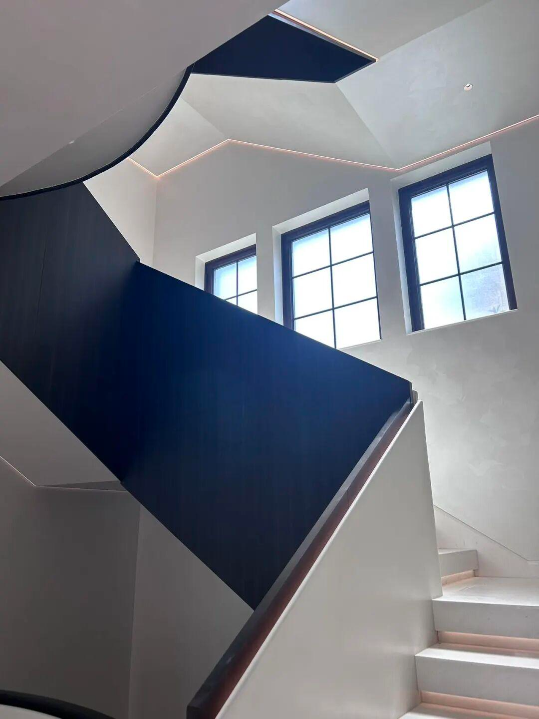 作为连接上下层的核心动线,楼梯间以珍珠绒塑造出极简而富有层次的视觉体验。白色踏步与墙面的涂料一体化设计,让黑白对比的楼梯扶手成为空间焦点;扶手处的几何发光装置,在珍珠绒墙面投射出温润的光影,每一级踏步的明暗变化都如细腻的呼吸感,将通行动线转化为沉浸式的质感体验。