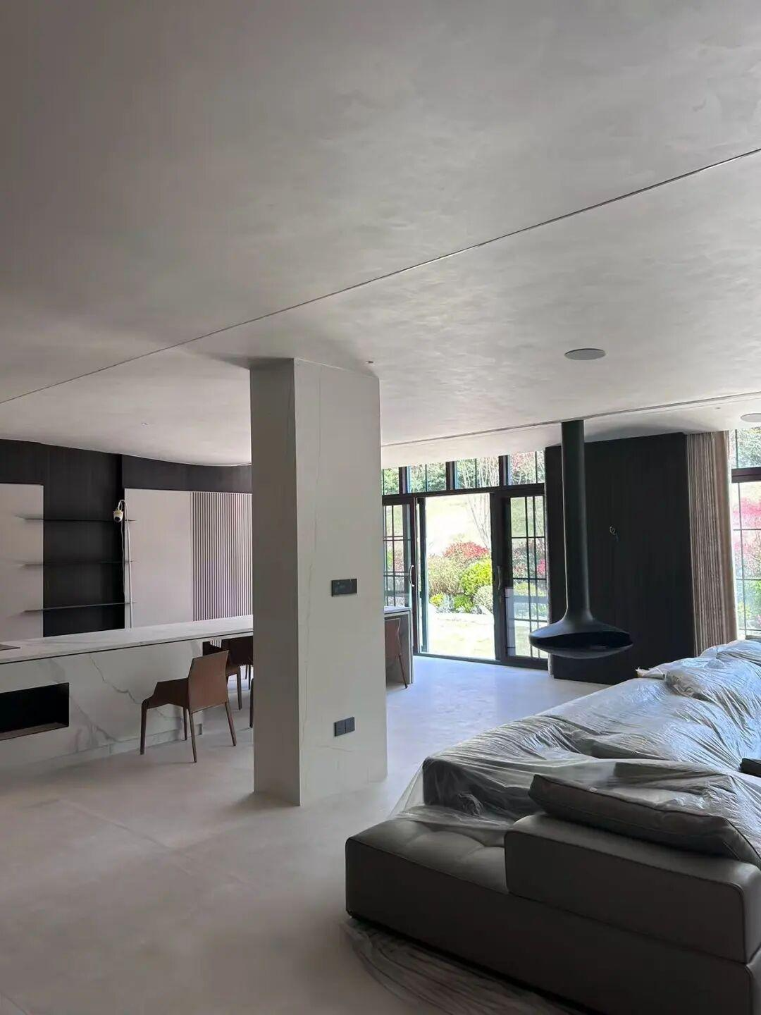 在别墅首层的客餐厨一体化空间里,珍珠绒以大面积纯白哑光质感包裹墙面与顶面,与深黑胡桃木饰面、极简黑色壁炉形成强烈视觉对比。大尺度落地窗引入的自然光线,在珍珠绒表面形成细腻漫反射,弱化了空间的硬朗线条;未拆封的真皮沙发与大理石岛台在柔化的光线下,更显意式轻奢的松弛感。立柱与墙面的一体化涂料处理,让结构边界消弭于柔和的肌理中,进一步强化了空间的开阔感。