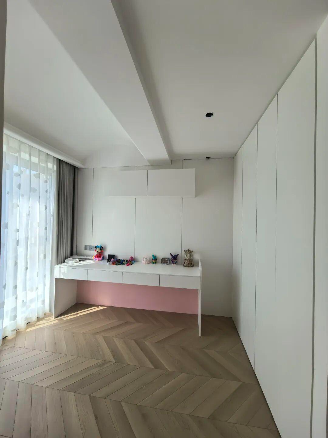 走进卧室区域,凯丽抗醛平光与玛泰涂料的组合,让私密空间兼具温馨与质感。儿童房里,凯丽抗醛平光涂料打造的白色墙面搭配粉色书桌,柔和的平光质感弱化了色彩的跳跃感,抗醛配方也为孩子筑起健康屏障;另一侧的卧室墙面则选用玛泰涂料,其温润的肌理与鱼骨拼木地板相得益彰,在简约布局中传递出松弛的睡眠氛围。