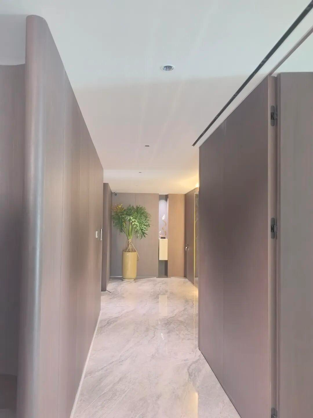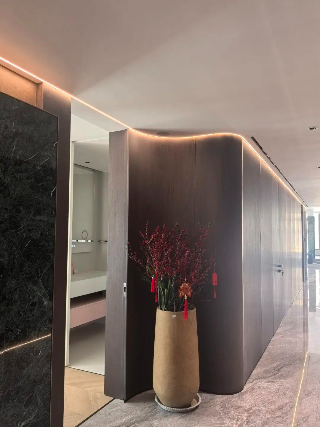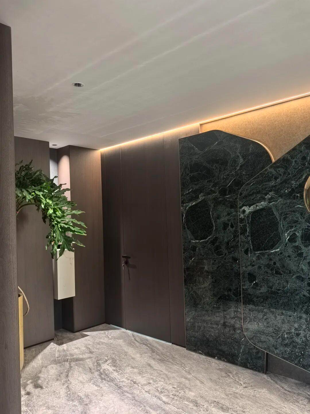 连接公共与私密空间的过道,是设计师巧思的过渡场域。这里的顶墙全部采用 TIXE( 泰科斯系列)的玛泰涂料,源自意大利 TIXE SRL 工厂的研发配方,玛泰涂料的耐磨抗污特性,完美适配过道高频使用的场景;而其细腻的哑光质地,与弧形木质墙面、墨绿色大理石装饰板自然融合,在嵌入式灯光的勾勒下,营造出静谧且高级的行进体验。