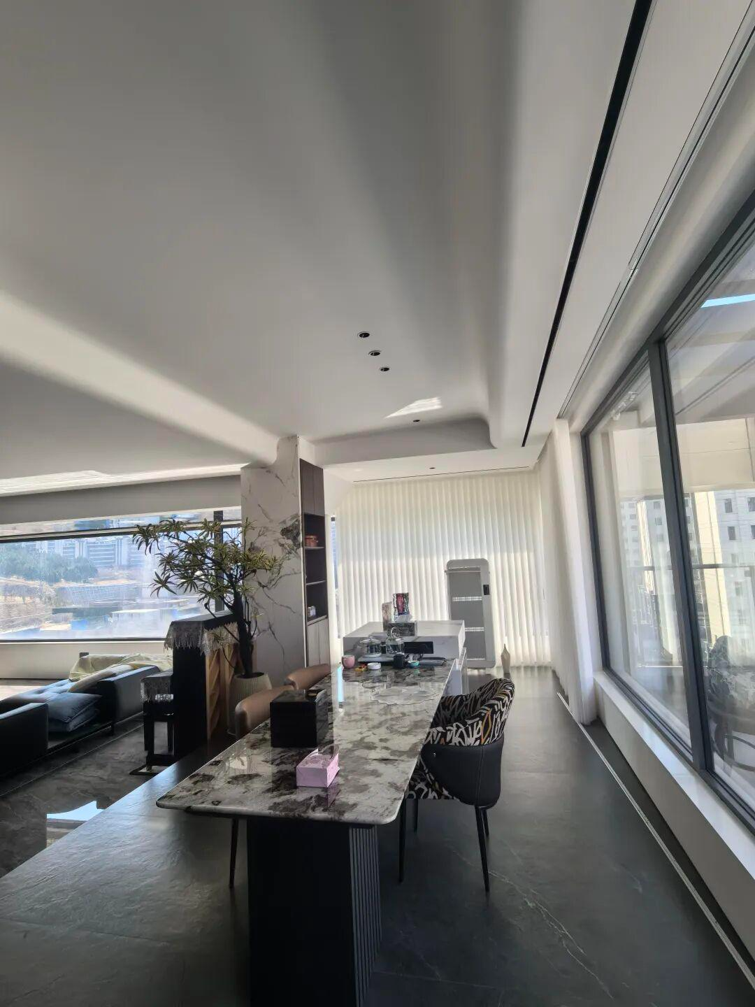 步入客餐厅,整面通透的落地窗将城市建筑景观引入室内,与凯丽抗醛平光涂料打造的墙面形成完美呼应。作为奥斯罗贵族系列的核心产品,凯丽抗醛平光涂料以细腻的平光质感呈现出纯粹的白色基底,既强化了现代简约风的利落线条,又凭借抗醛环保的功能,让开阔的公共空间兼具美观与健康。