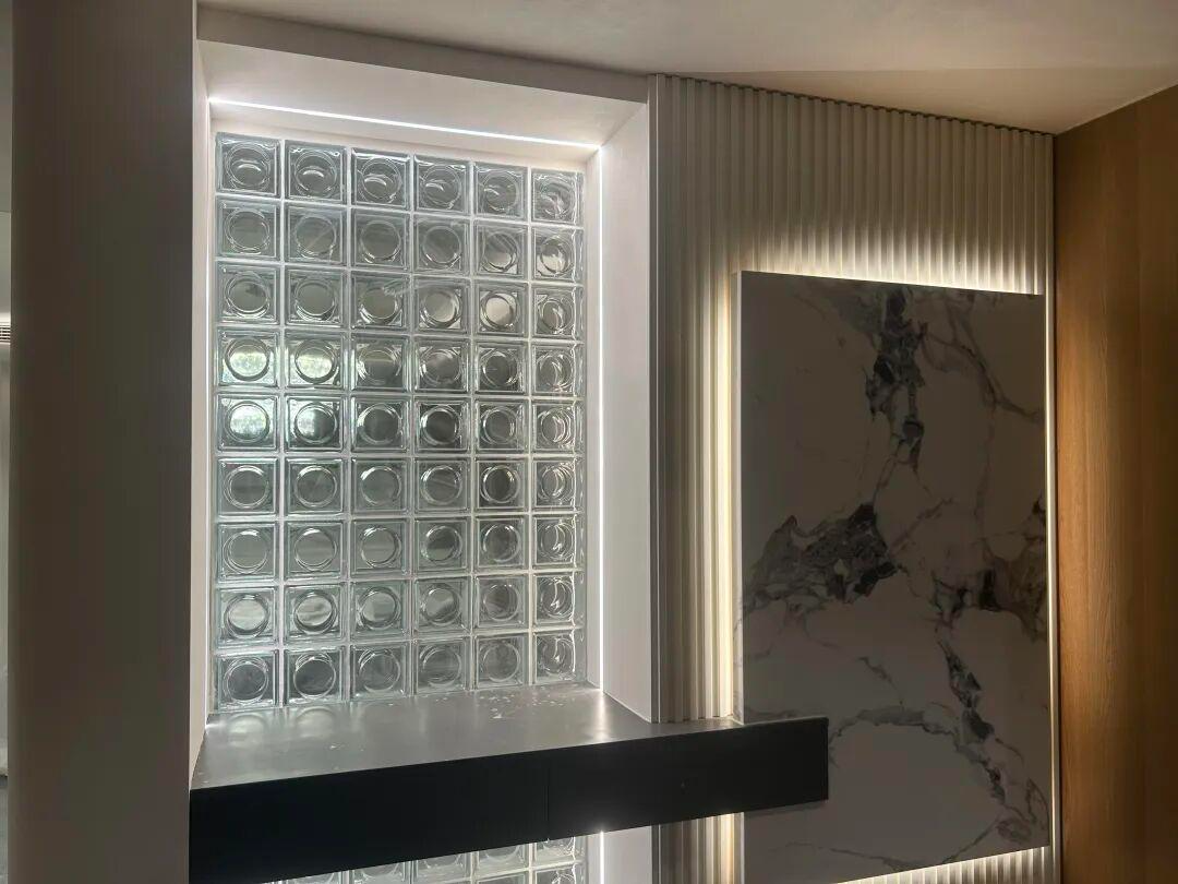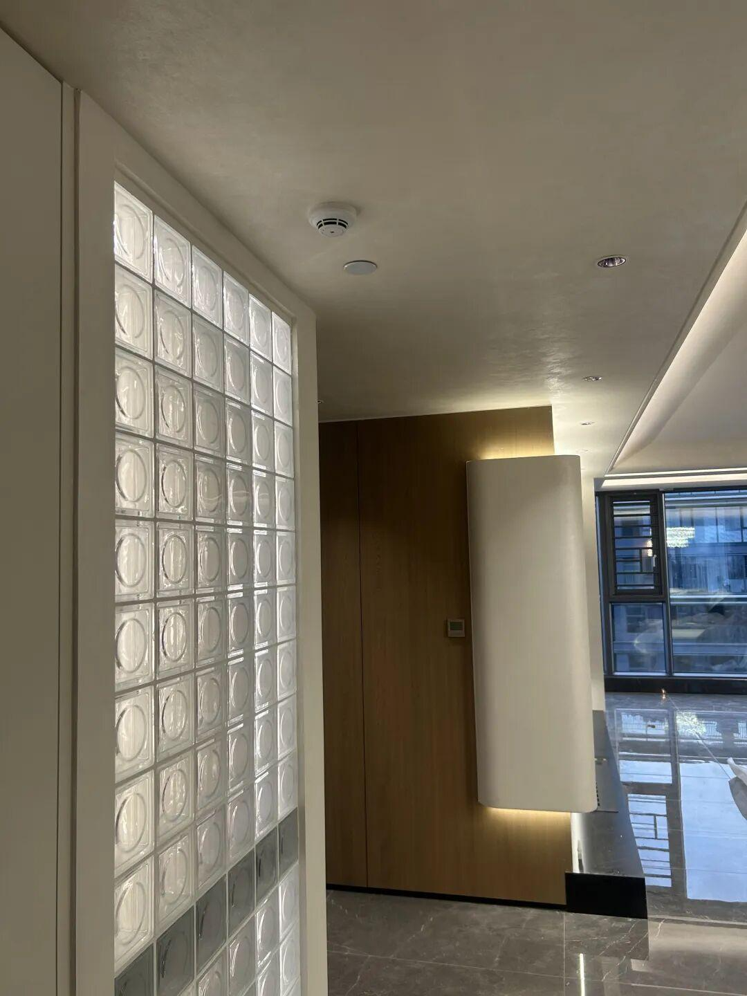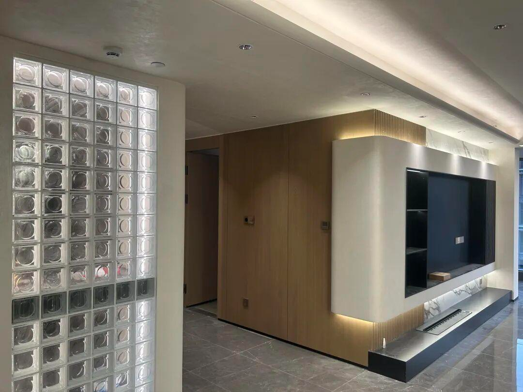 推开门的瞬间,便撞进一场通透与温润的双向奔赴。玻璃砖隔断携着轻盈的光影扑面而来,冷冽的通透感却被身旁的墙面稳稳承接——那是斯达丝绸赋予的米白色温柔,指尖抚过,丝滑细腻的触感毫无颗粒感,仿佛触碰到真丝织物的肌理。嵌入式筒灯的柔光漫过墙面,藏在肌理中的细碎珠光缓缓浮现,层次错落的光泽像揉碎了星光,悄悄消解了玻璃砖的冷硬,为入户玄关铺就了一层雅致的底色。站在这里,光影在通透与丝滑间流转,归家的第一步,便与仪式感撞了个满怀。