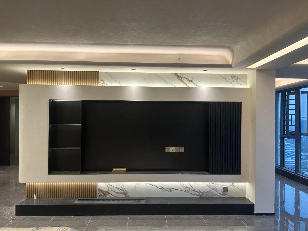 穿过玄关,客厅的质感画卷徐徐展开,斯达丝绸早已成为这方空间的“隐形主角”。电视背景墙以米白色丝质肌理为基底,哑光黑嵌面的利落、浅木格栅的温润与大理石纹理的厚重在此相遇,本是棱角分明的材质碰撞,却因丝质墙面的柔化,褪去了所有尖锐。硬朗的石材被裹上一层温润滤镜,利落的金属线条也添了几分柔和,现代设计的先锋感与贵族面料的雅致感,在此达成绝妙平衡。