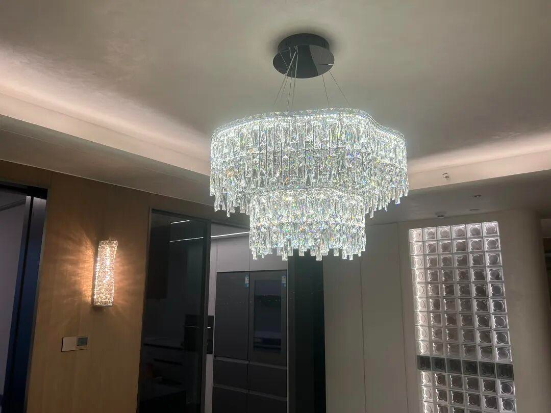 抬头望去,天花板亦被斯达丝绸温柔包裹,与悬浮吊顶的线性灯光默契呼应。丝质肌理将光线均匀漫散,视觉上悄然拉伸了层高,让空间显得愈发开阔通透。中央水晶吊灯亮起时,璀璨光芒与墙面的细腻珠光交相辉映,光影流转间,奢华感不张扬、不刻意,只在丝滑肌理中自然流淌,让客厅既成为招待宾客的气场场域,也藏着日常相处的松弛暖意。
