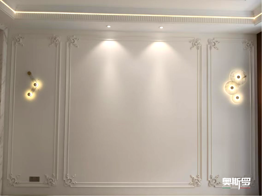 - 大面积墙面在灯光下光泽温润均匀,完美衬托法式石膏线的精致,让空间更显高级通透。