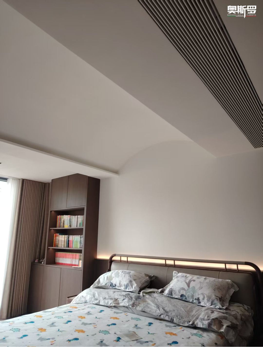二层卧室区域,玛泰以更柔和的姿态包裹空间。弧形吊顶与墙面弧度完美契合,没有尖锐棱角,只有被光线柔化的边界。无论是主卧里的休憩安眠,还是次卧里的日常嬉闹,玛泰的高硬度与隔音性能,都让这份静谧与安心,成为家最珍贵的底色。