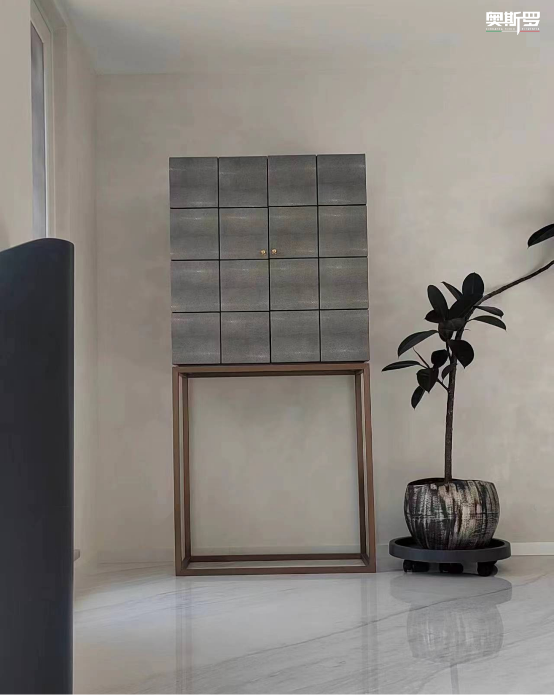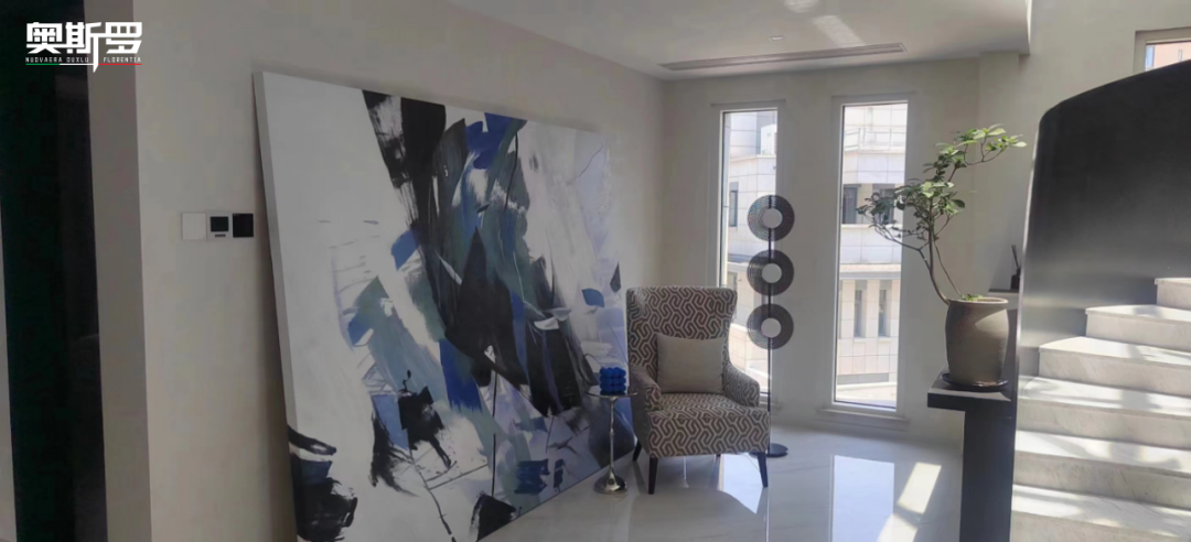 步入别墅公区,最先沦陷于视线的,是奥斯罗 OUXLU( 贵族系列)的斯达丝绸。作为奥斯罗核心产品,它携着意大利 GFC CHIMICA S.R.L. 工厂的百年工艺底蕴,以丝缎般的柔光肌理,为武汉的江风与日光铺就了专属舞台。