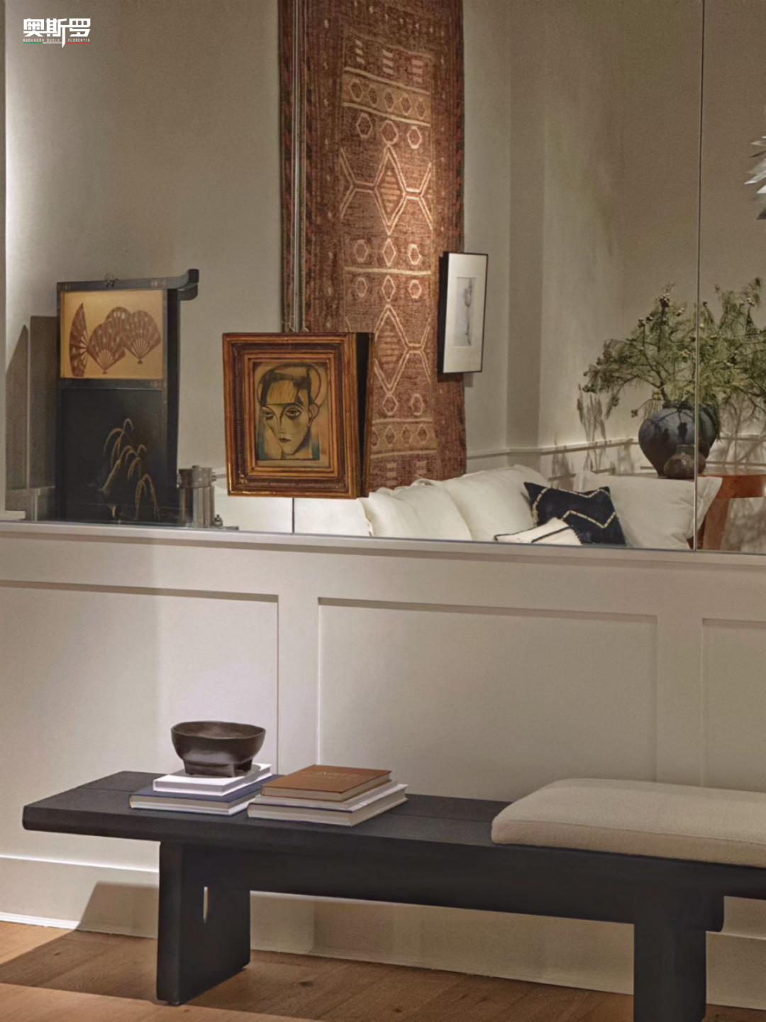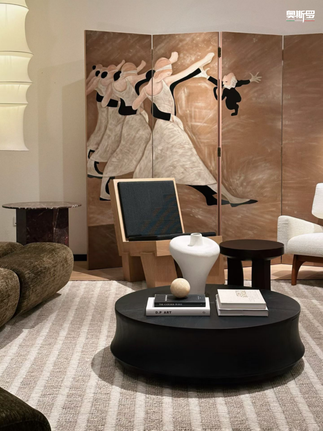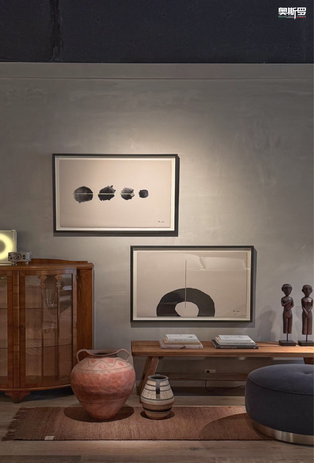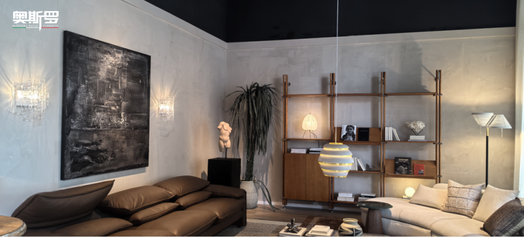 墙面的复古斑驳肌理与展厅内的木质家具、艺术画作、绿植摆件等完美契合、相得益彰。温润的木质家具衬得肌理更显沉稳,抽象画作与斑驳墙面形成视觉呼应,绿植的生机则中和了复古质感,让空间层次丰富,既具复古韵味,又充满自然松弛感,精准契合展厅“自然与艺术共生”的设计理念。