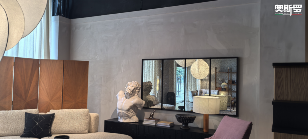 威尼斯砂泥来自意大利GFC工厂,是传承文艺复兴美学的矿物漆瑰宝。奥斯罗OUXLU(贵族系列)承袭古法工艺,甄选意大利石灰质原矿与天然砂粒、环保颜料,获3C与法国A+双重环保认证,兼顾传统质感与现代需求。团队融合北欧松弛感与意式厚重感,以砂泥打破风格边界,打造出复古简约的展厅氛围,让观者在光影与肌理间感受空间美学。