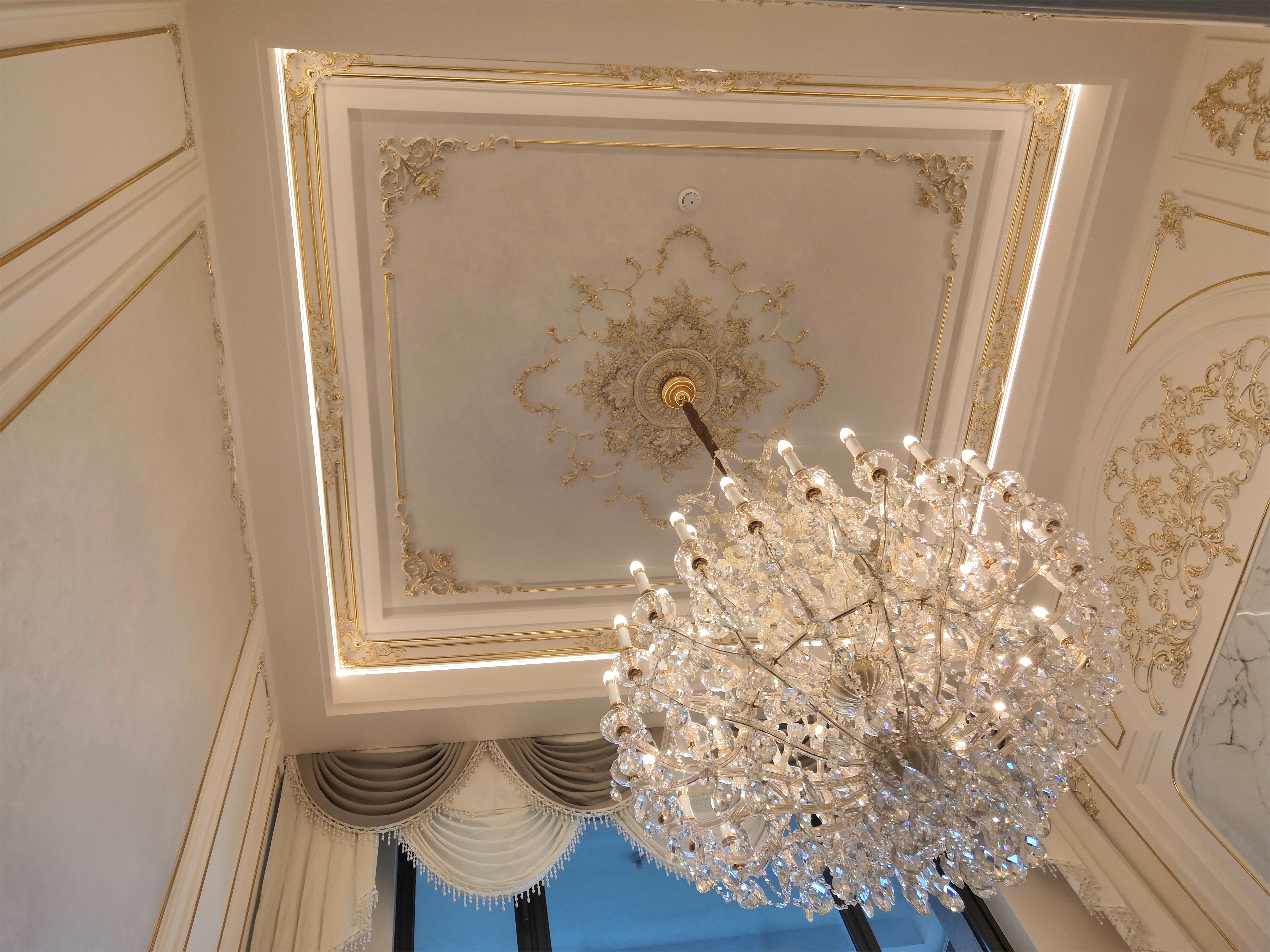 连接公共与私密空间的过道,是设计师巧思的过渡场域。这里的顶墙全部采用 TIXE( 泰科斯系列)的玛泰涂料,源自意大利 TIXE SRL 工厂的研发配方,玛泰涂料的耐磨抗污特性,完美适配过道高频使用的场景;而其细腻的哑光质地,与弧形木质墙面、墨绿色大理石装饰板自然融合,在嵌入式灯光的勾勒下,营造出静谧且高级的行进体验。