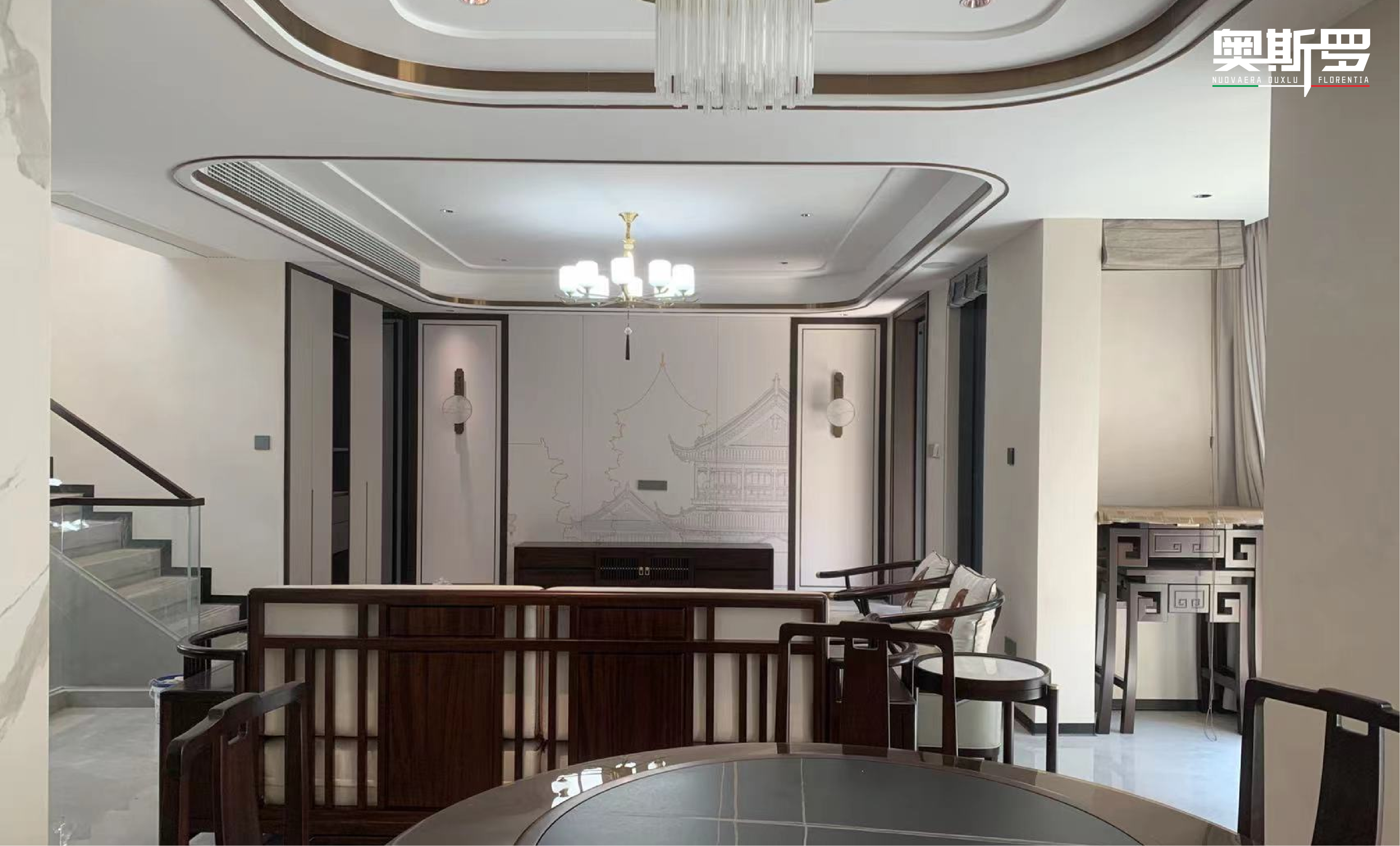 抬头望去,天花板亦被斯达丝绸温柔包裹,与悬浮吊顶的线性灯光默契呼应。丝质肌理将光线均匀漫散,视觉上悄然拉伸了层高,让空间显得愈发开阔通透。中央水晶吊灯亮起时,璀璨光芒与墙面的细腻珠光交相辉映,光影流转间,奢华感不张扬、不刻意,只在丝滑肌理中自然流淌,让客厅既成为招待宾客的气场场域,也藏着日常相处的松弛暖意。