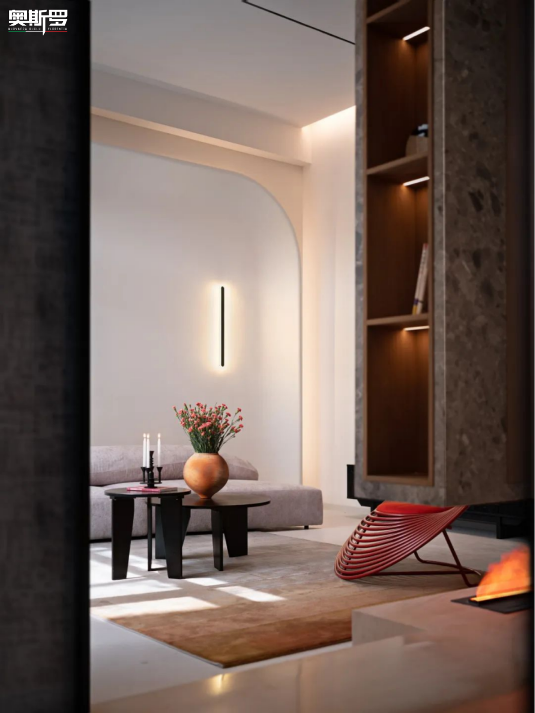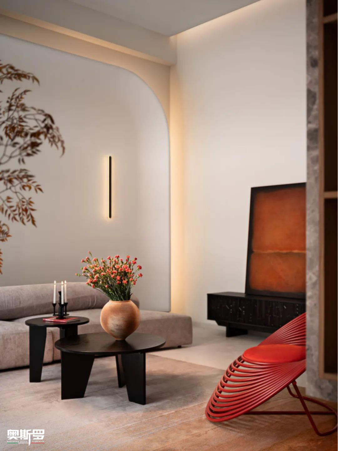 风格与效果:现代简约的线条里,蛋壳光墙面成为最温柔的背景。它承托着浅灰沙发的慵懒、红椅的跳脱,也让暖橙挂画与陶土花瓶的肌理更显层次。弧形墙面与线性壁灯的光影,在蛋壳光表面被温柔晕染,消解了硬朗线条的冷感,让整个空间多了几分包裹感与松弛感。